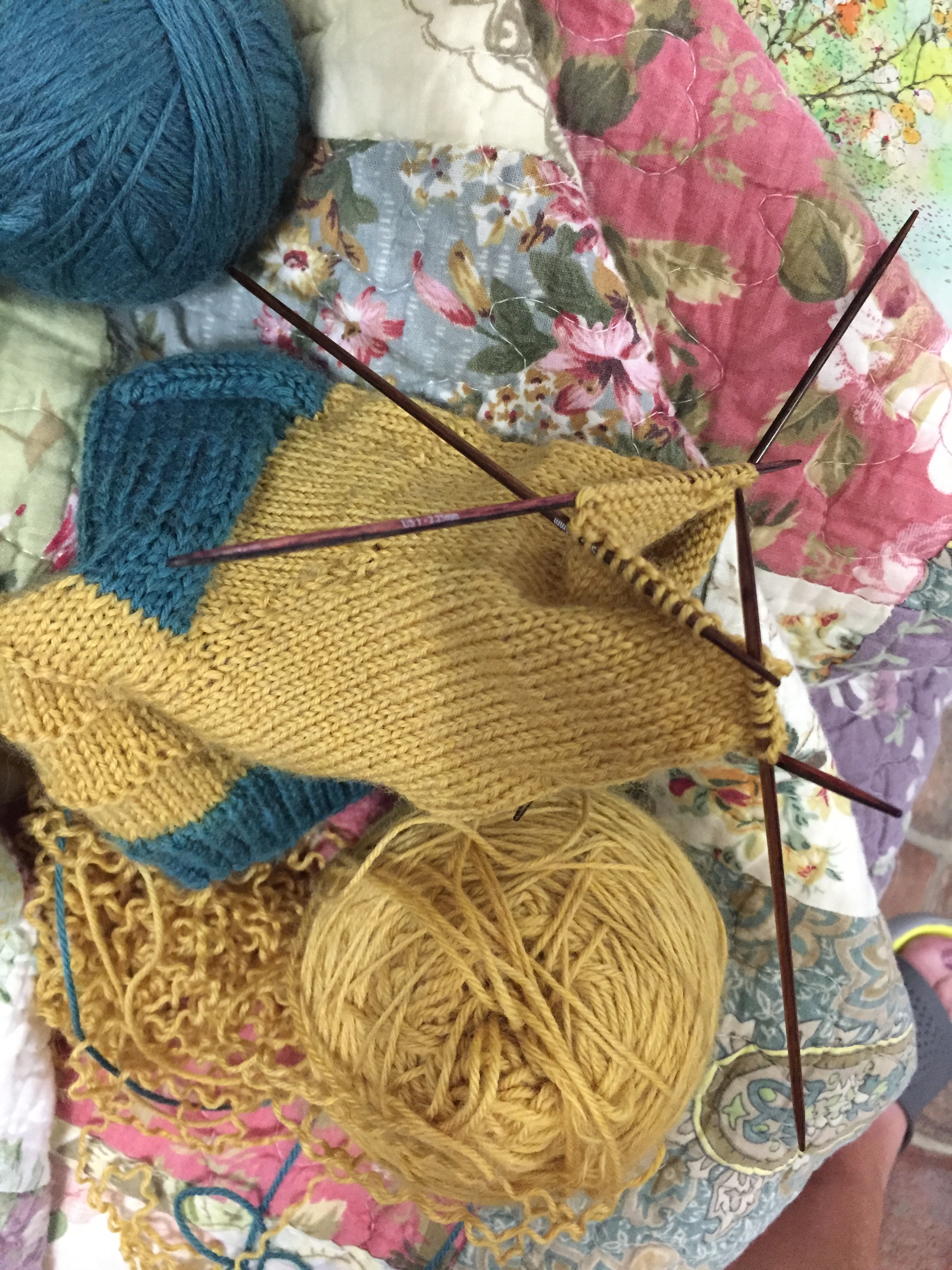 Instead of casting on another pair of socks I dug around for this WIP. I started out with Little Bobbins Knits Twas the Night Before Christmas pattern (an excellent pattern!) but I didn’t want to make trees on the leg so I created purl rounds instead. I really like the twisted ribbing and the way she wrote the heel and gusset instructions. I’ll use the instructions again. The colors are muddy. They remind me of my elementary school because we were the Vikings (ha ha ha) and our colors were green and gold. Go Vikings!