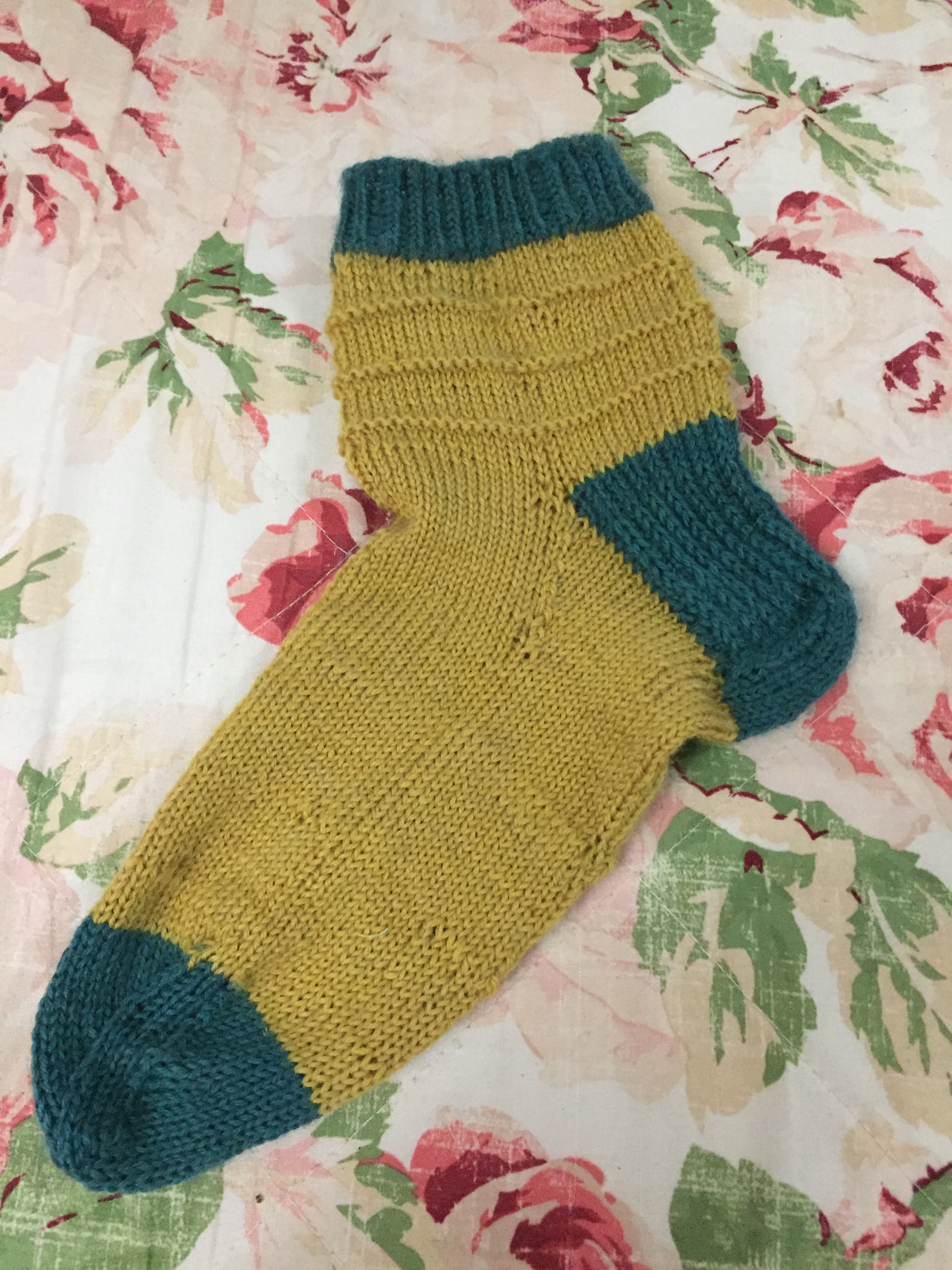 A sock finished one and a half years after I started it (Christmas Eve 2017). It languished in a bag and the needles came out a few times thus the bumpy stitches. The wool wasn’t a great choice, but IT FITS really well, so yay!