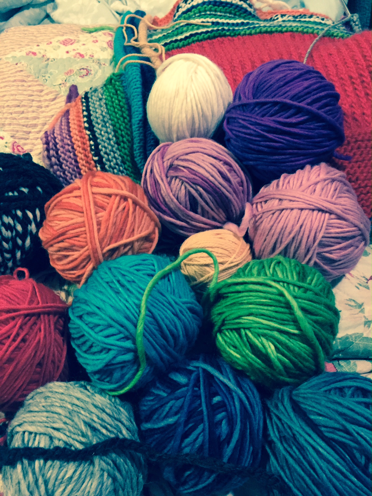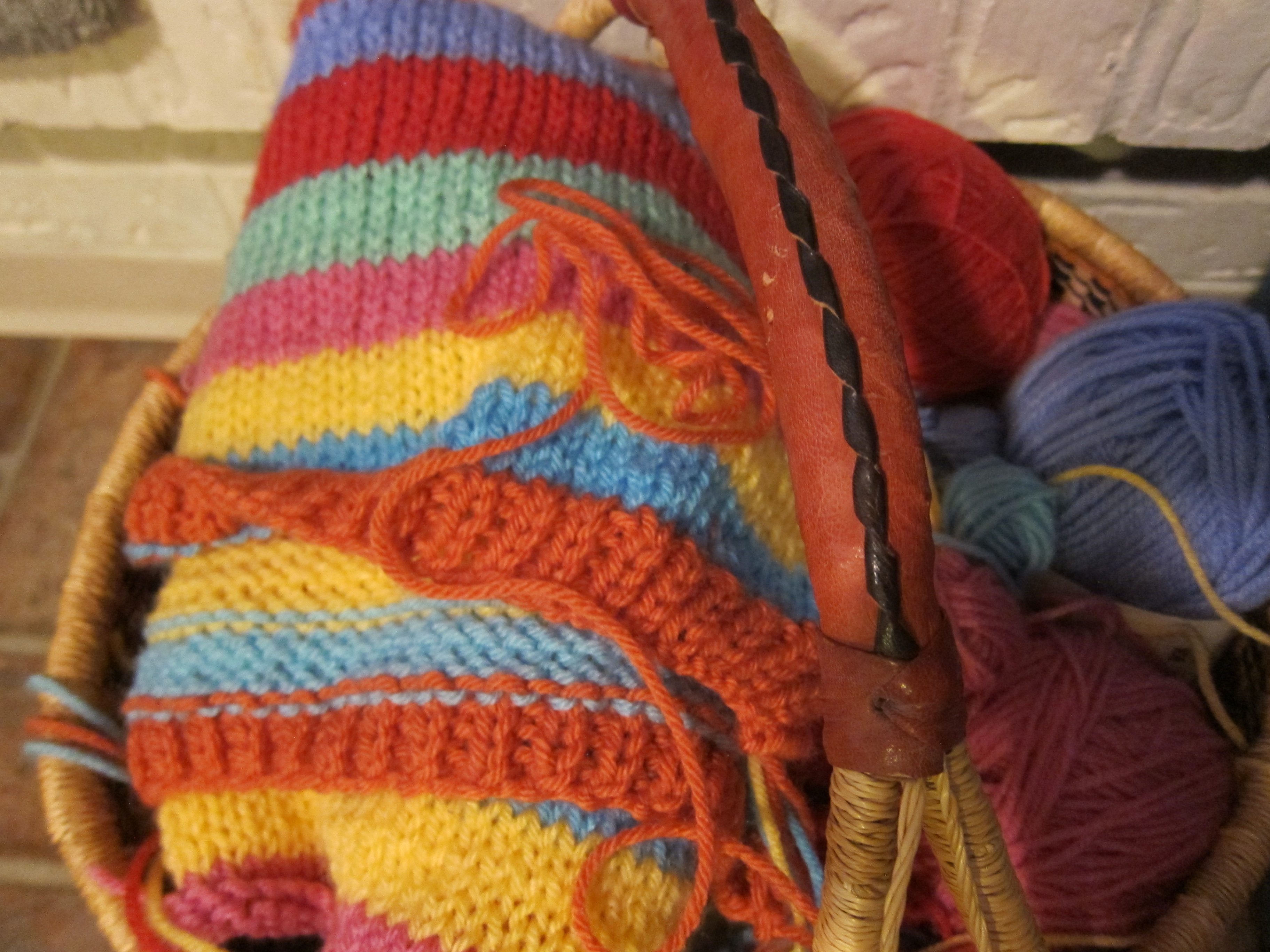 The stripes below were going to be a sweater but the dropped shoulders were tight (I was fatter then) so I took them off and now I just have one sleeve opening to rib and it will be an FO, a vest. I even bought a knit turtleneck (such a granny thing) to wear with it. It’s a little clownish, but extremely cheerful. A win.